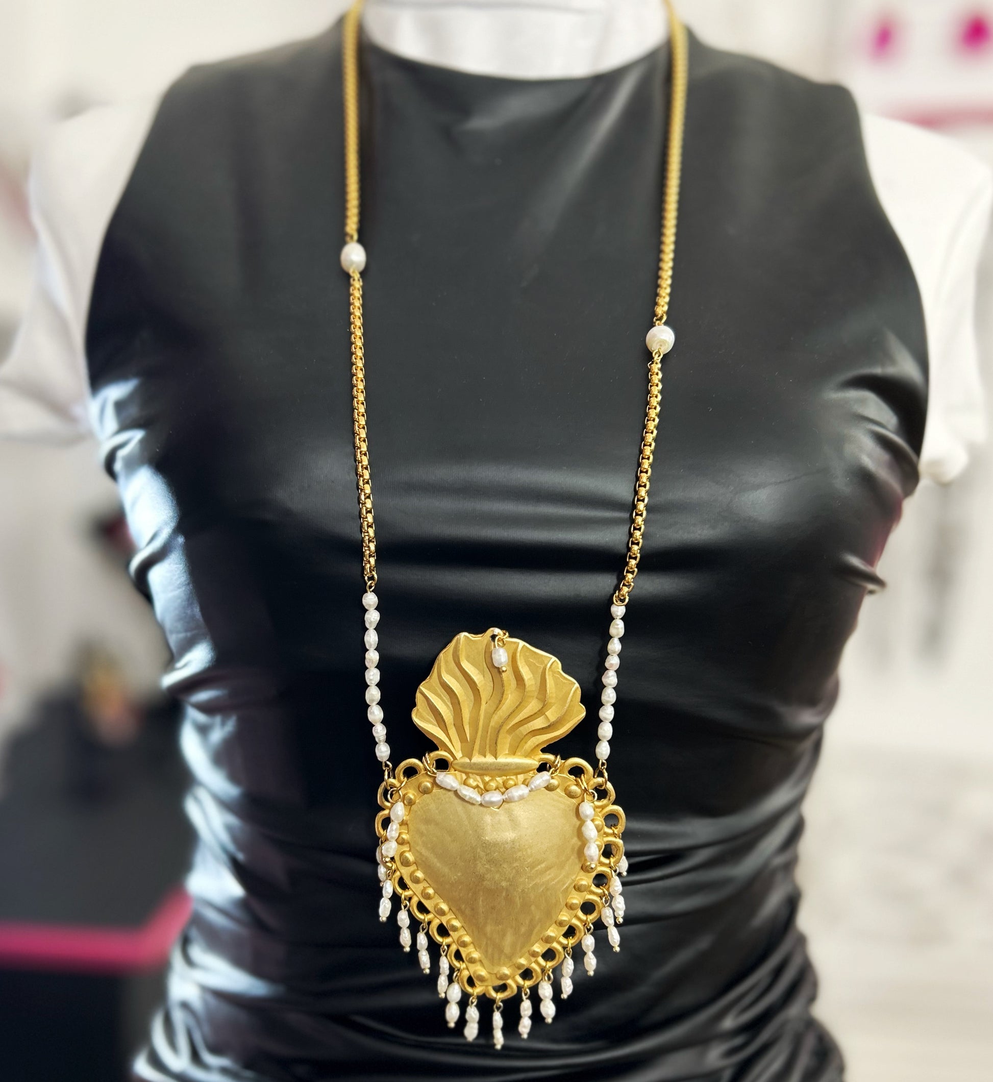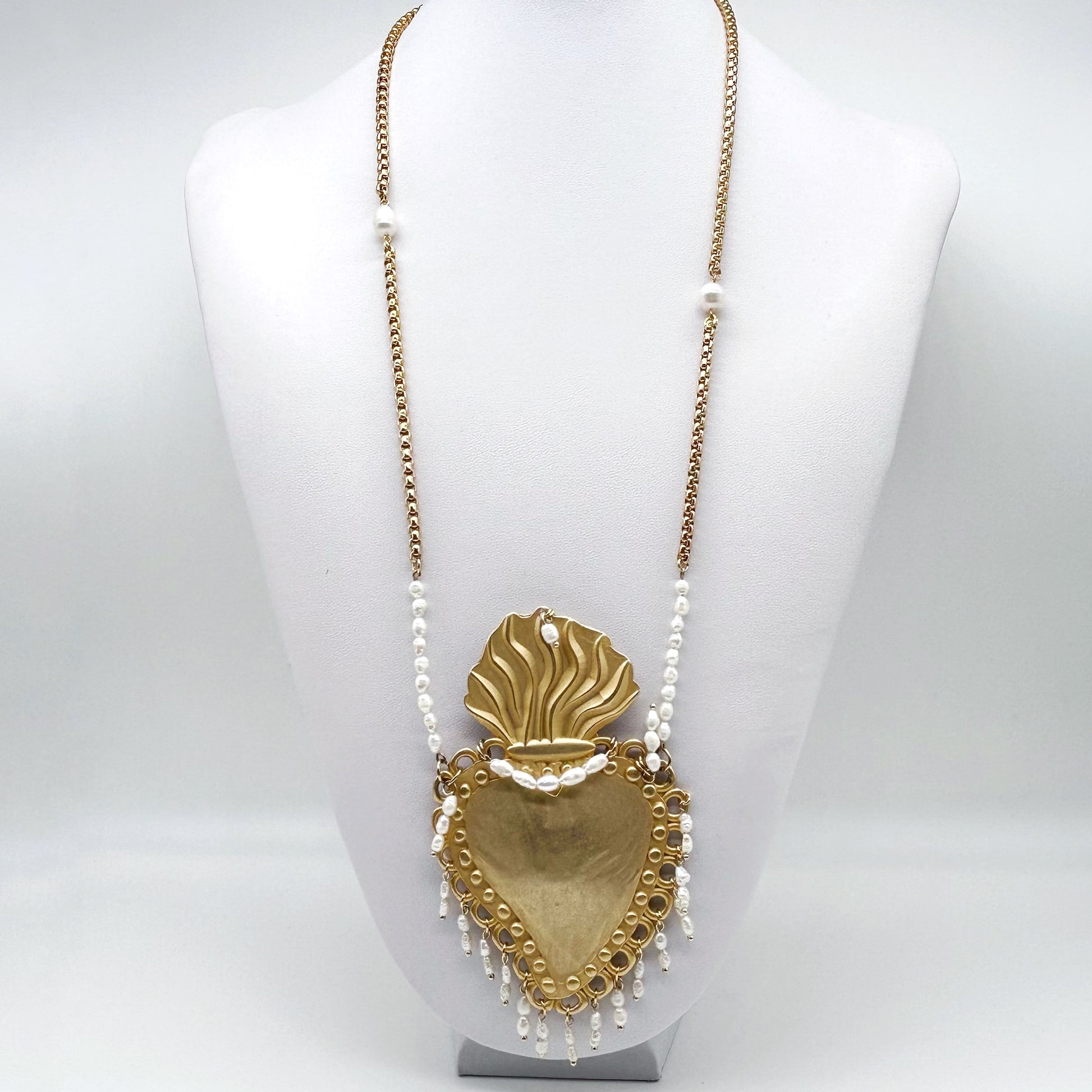 Collana con catena lunga in acciaio dorato alternata da due perle. Cuore Sacro maxi In zama oro alto 13 cm, arricchito da tante piccole perle di acqua dolce.