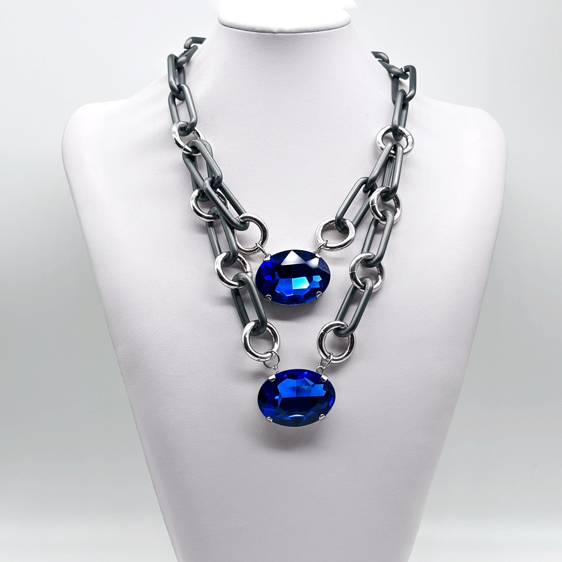 È una collana molto leggera in alluminio con maglie diverse, grigio satinato e argento ma c’è anche la versione dorata