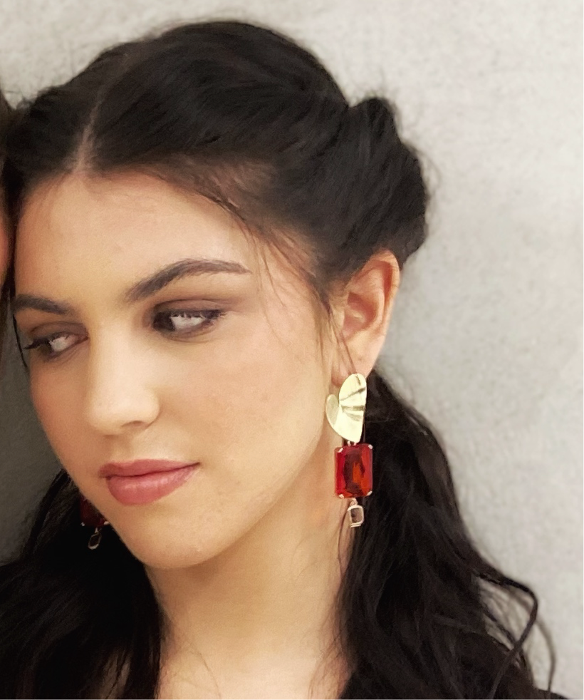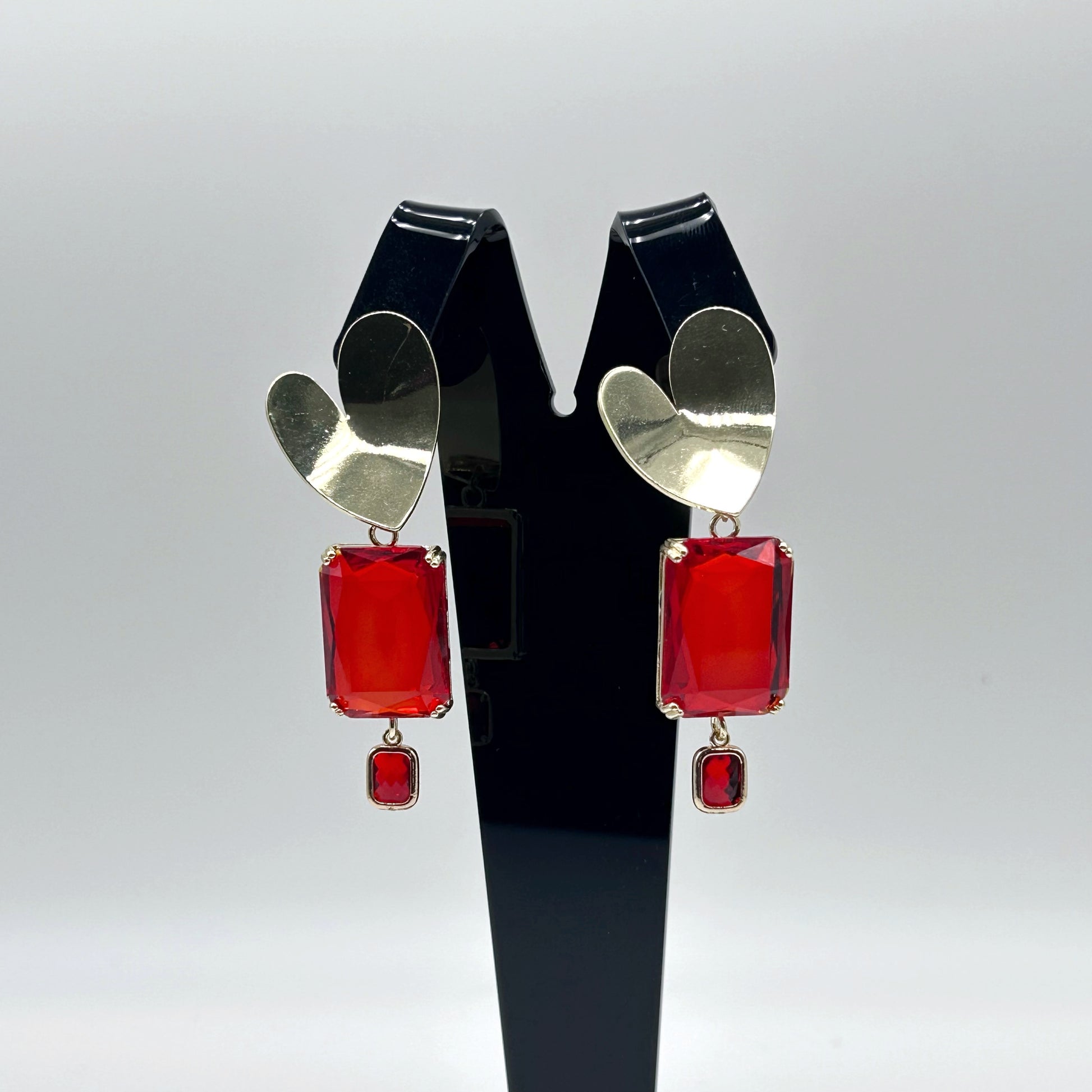 Orecchini pendenti con perno a cuore in ottone dorato lucido, maxi cristallo con castone in ottone e cristallino colorato